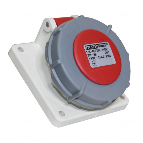 Розетка 4142 PRO прихована 3Р+PЕ 16А 380В IP67 TNSy - застосовується зовні або всередині різних будівель, наприклад для забезпечення електрикою кіосків, побутівок, для використання в будинках відпочинку та готелях, а також для підключення електроінструментів, верстатів та іншого промислового обладнання. Корпус і ізолюючі деталі, а також несучі струмопровідні частини силового роз'єму виконані з матеріалів, що самозагасають. Кришка силової розетки добре закріплена, що забезпечує захист від попадання пилу та вологи всередину роз'єму. Пружини захищені від корозії. Гвинти, що застосовуються для механічних та електротехнічних з'єднань, захищені від самовідгвинчування. Силову розетку можна експлуатувати у вологому та запиленому середовищі. Має спеціальний сальник для кабелю різного перерізу.