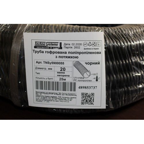 Труба гофрована поліпропіленова, з протяжкою, НГ стійка до УФ 20, чорна,важка (25м). Якість та низька ціна від українського бренду TNSy.